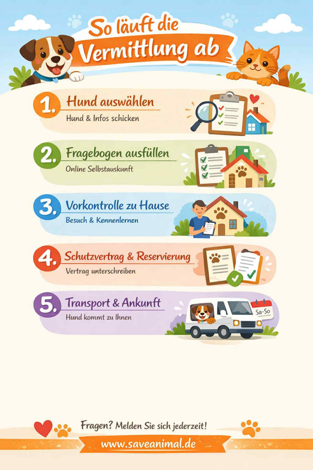 • organisatorische Fragen zur Eingewöhnung (z. B. Urlaubsplanung, Betreuung, Hundeschule)